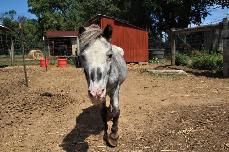 Dolly is a mini-mule and she really is mini! Sweet natured and silly now, she was completely feral when she came us. Dolly was the product of a divorce.